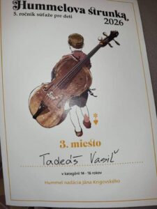 12 mar Súťažná prehliadka Hummelova strunka 2026 v Senci Hummelova strunka 2026 – 9. marec 2026 Náš talentovaný žiak Tadeaš Vasiľ sa zúčastnil medzinárodnej súťaže Hummelova strunka v Senci, kde získal výborné 3.miesto. Gratulujeme ku krásnemu úspechu a ďakujeme za skvelú reprezentáciu našej školy. Držíme palce v ďalších hudobných výzvach.